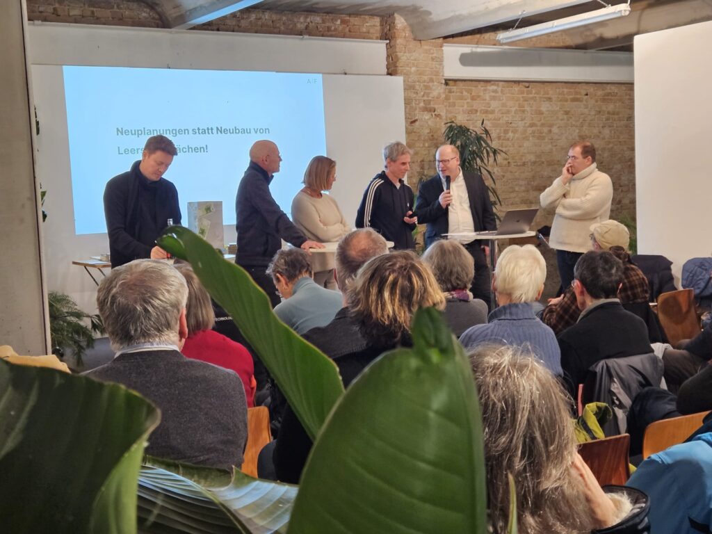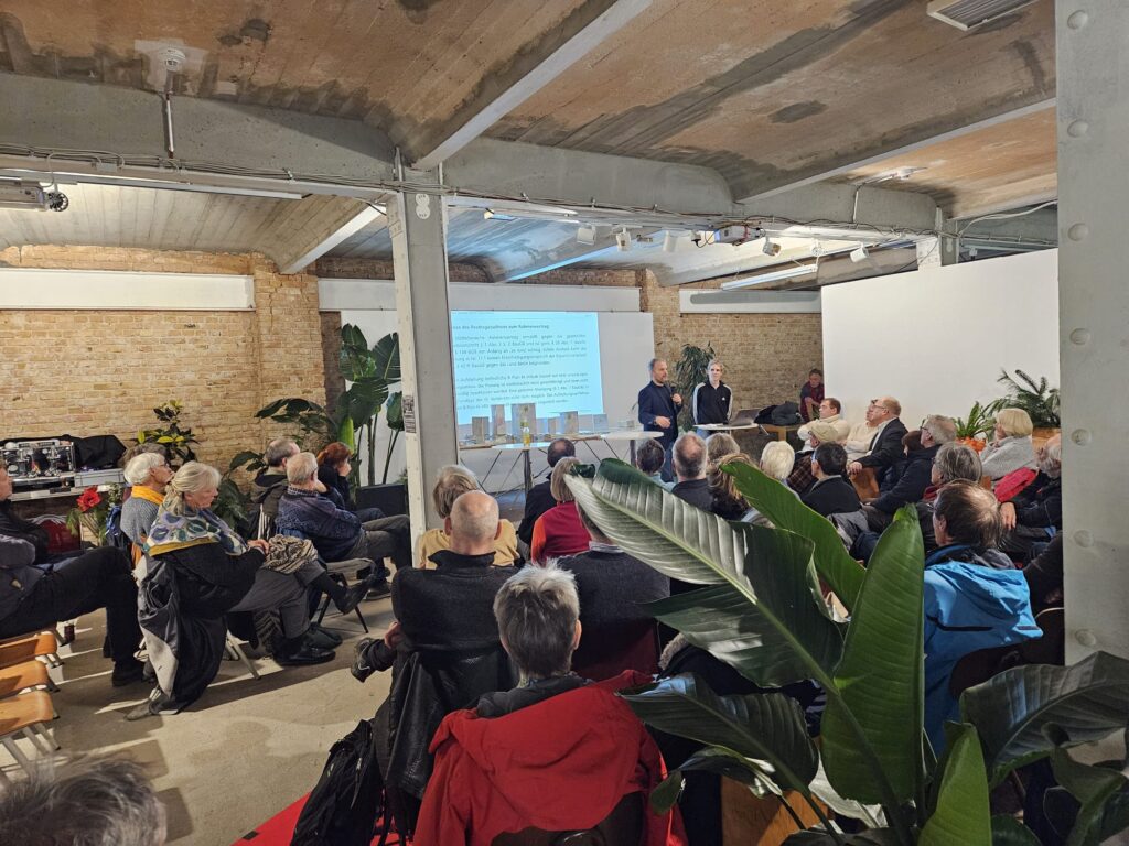 Die Aktionsgemeinschaft Gleisdreieck e.V. hatte am Dienstagabend, den 9. 12. 2025, zur Debatte um die vom Projektentwickler Periskop so genannte „Urbane Mitte“ Gleisdreieck ins Kühlhaus, Luckenwalder Str. 3 eingeladen. Es diskutierten gewählte Vertreter der ehemaligen Regierungsparteien über die Hochhaus-Bebauungspläne am Gleisdreieck vor dem gleichnamigen U-Bahnhof. Die CDU war mehrfach eingeladen worden, wollte sich aber nicht öffentlich zu den Plänen äußern und blieb der Veranstaltung fern.