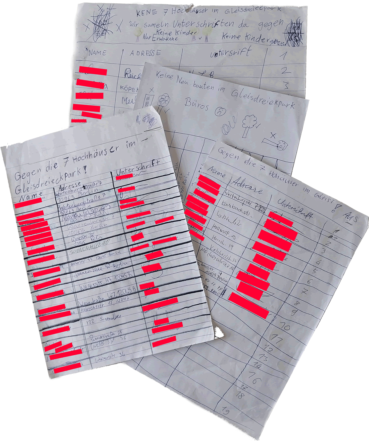 Neben den Spenden werden wir weiter Unterschriften für unsere Petition sammeln. Zwar haben wir am 26. Februar schon einmal die Petition mit 36.371 Unterzeichner:innen im Abgeordnetenhaus übergeben. Aber das ist nur ein Zwischenstand. Hier zu sehen sind 49 Unterschriften, die von Kindern gesammelt wurden. Wir werden sie bei geeigneter Gelegenheit der Politik übergeben, ebenso wie unsere Online-Petition, die weiterläuft.Vielleicht erreichen wir noch die 50.000?
